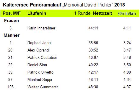 Vom SLV beteiligten sich 13 Mitglieder am Wettkampf. Als vierzehnte Frau und Dritte ihrer Altersklasse erreichte Karin Innerebner aus Bozen unser bestes Ergebnis. Unter den ersten Zehn in der Kategorie blieb auch Felix Huber. Mit 17:26 Minuten erzielte Raphael Joppi aus Salurn die beste Laufzeit unserer Mannschaft, kam als Gesamt-21ster ins Ziel und in seiner Altersklasse von 63 Mitbewerbern auf den 18. Rang. Unter 20 Minuten blieben noch unser neues Mitglied Daniel Sinn und Vereinspräsident Patrick Olivetto. Den Tagessieg holte sich der deutsche Cross-Meister Konstantin Wedel in guten 15,14 Minuten.