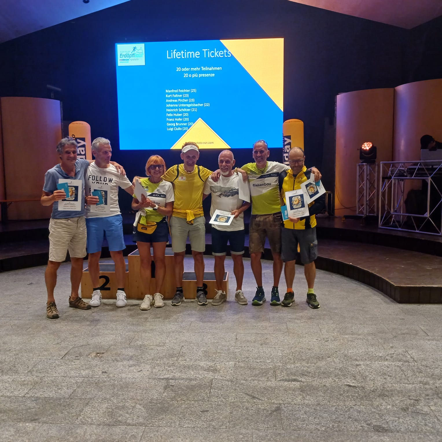 Wie schon in der letzten Ausgabe erwähnt, fand am Samstag, den 24. August der große Jubiläumslauf des inzwischen als Erdäpfllauf (17,6 km) bekannten Rennens auf dem Radweg von Bruneck nach Sand in Taufers statt. Auch der SLV war diesmal mit 12 Finishern stark vertreten und holte sich in der 10-er-Mannschaftswertung den guten 5. Platz. Einige SLV-ler*innen erreichten sehr gute Platzierungen und Zeiten und holten dabei durch Albert Colz (1. M75), Decassiani Palfrader Monika (2. F35), Alex Oprandi (2. M40) und Burkard Zozin (2. M65) einen Kategoriensieg und drei 2. Kategorienplätze. Der SLV-ler Manni Feichter wurde als inzwischen einziger Teilnehmer, der an allen 25 Ausgaben teilgenommen und diese auch alle beendet hat, besonders geehrt. Weiters wurden auch alle jene geehrt, die an mindestens 20 Ausgaben teilgenommen haben. Dazu gehörte mit Felix Huber (20 Teilnahmen) ein weiterer SLV-Athlet.