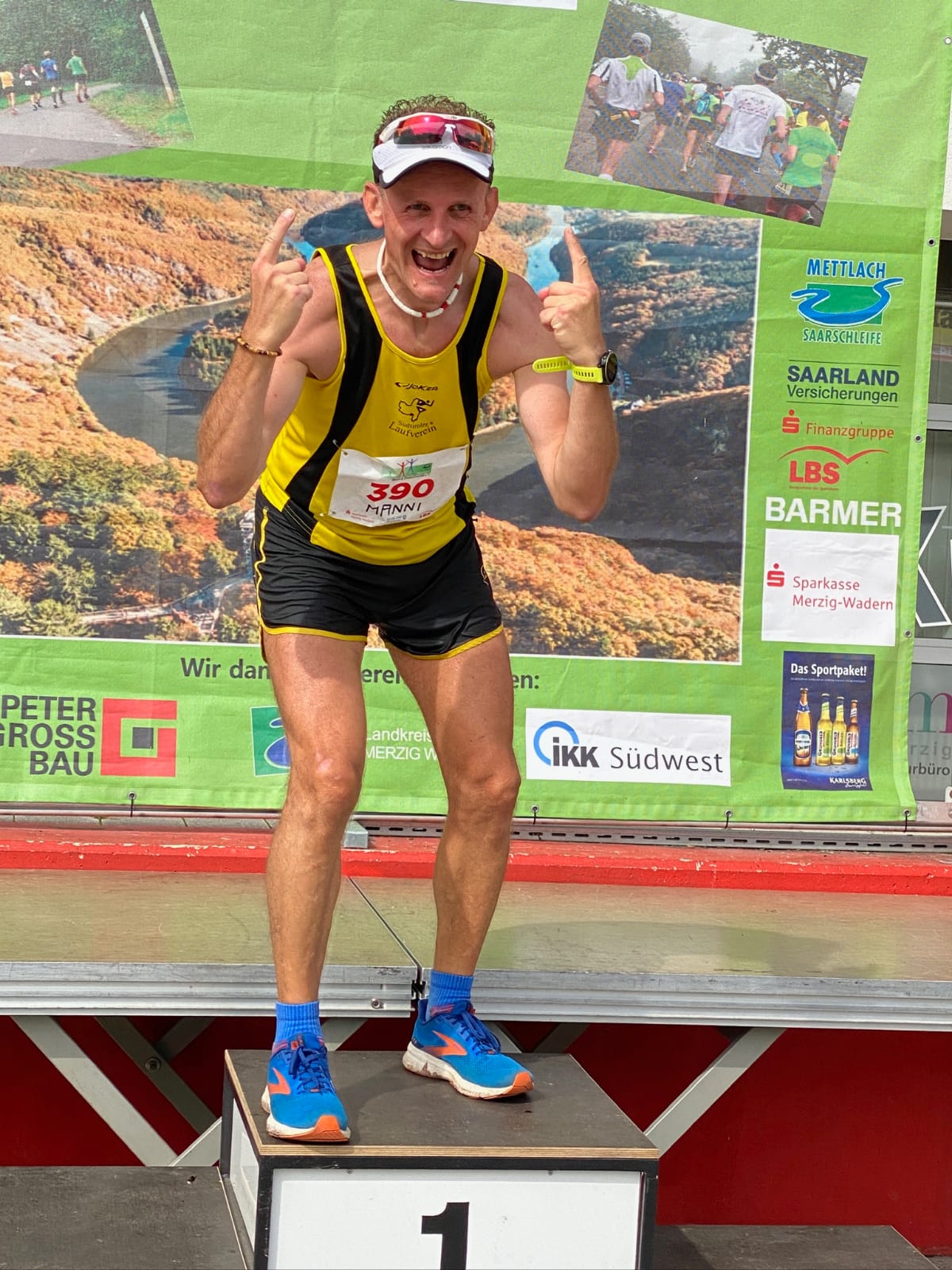Manni Feichter nutzte den Besuch bei Freunden im Saarland auch heuer wieder zu einer Teilnahme am 3. September beim 7. Saarschleifenland-Lauf in Merzig/Saarland. Manni lief so wie im Jahr 2017 auch diesmal die 15 km Distanz und konnte diesen Lauf genau wie vor 6 Jahren wieder gewinnen. Manni siegte diesmal in einer Zeit von 1:00:21 Stunden, diesmal noch viel überraschender als 2017 und er freute sich natürlich mächtig über seinen erst 2. Einzelsieg bei einem offiziellen Rennen.